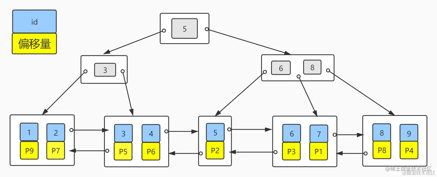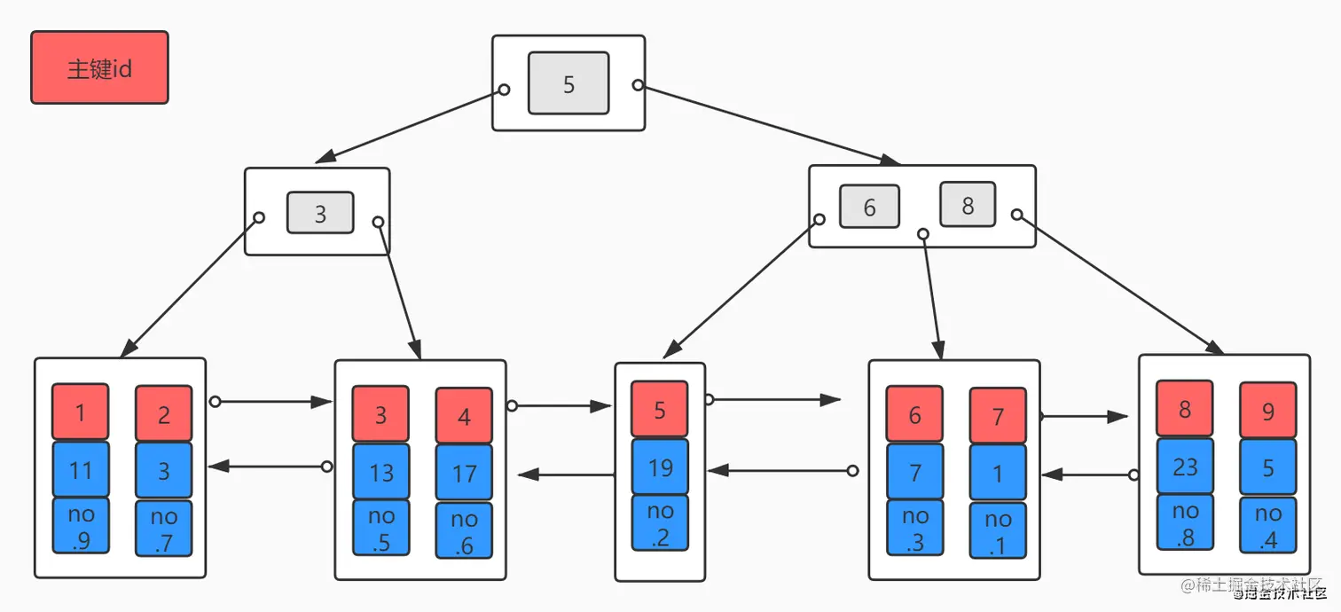 搞清楚了MyISAM的数据存储方式,再来看下主键索引的存储。我们假设每个磁盘块只能存储两个节点数据,MyISAM的主键分布如下图: