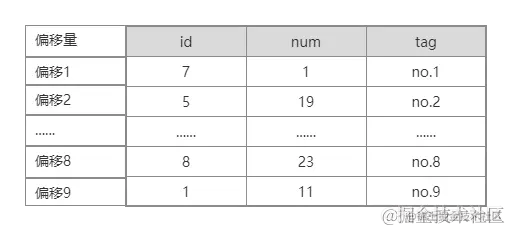 MyISAM按照数据插入的顺序存储在磁盘上,我们假设第一行数据在数据库表文件中的偏移位置是1,以此类推。 如下图