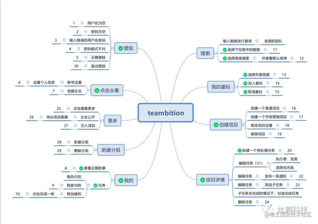 今天我们以测试teambition为例,给大家讲解。首先根据下图先设计出测试用例,开始正式的测试流程。