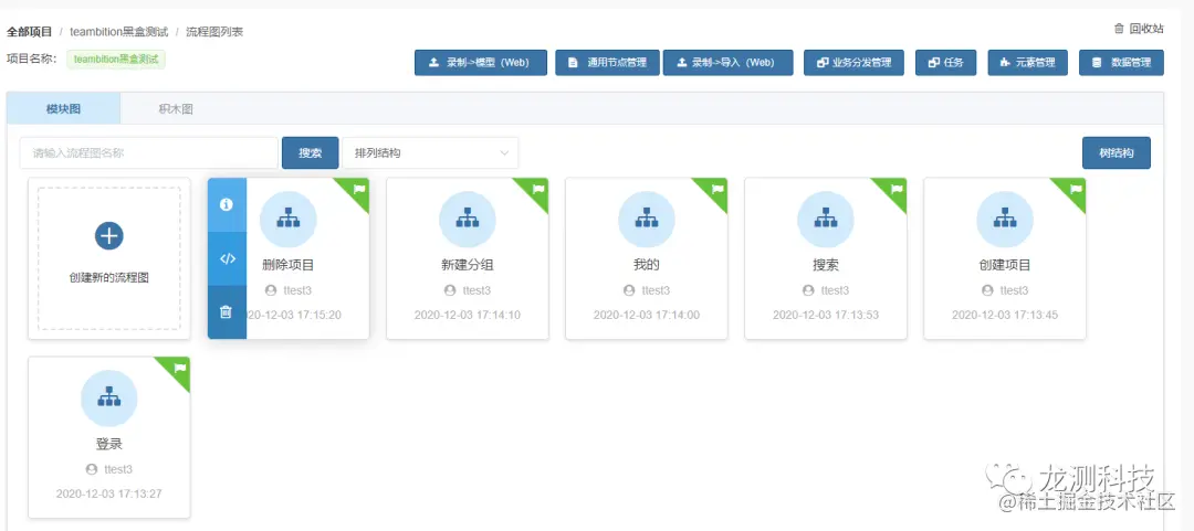 3 打开在龙测下载中心下载最新的sideex,从龙测“录制-导入”模块打开teambition网站,录制生成测试流程图,搭建积木图积木图,实现功能模块的功能测试。