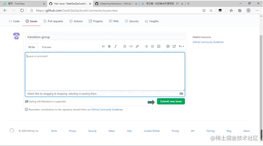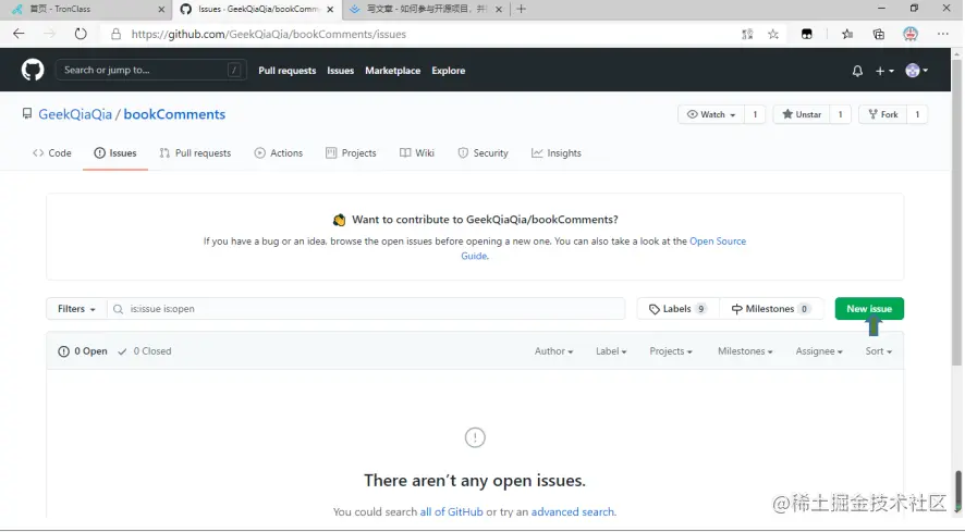 如何参与开源项目,并提issue AiHui 2020-12-04 445 阅读1分钟 第一步:点击你所需issue的项目 第二步:点击issues 第三步:点击new issue创建新问题 第四步:按照提issue 规范,命名对应title 同理:按照项目规范,书写issue对应的comment,通常在开源项目的Wiki里面可以查看 第五步:点击Submit new issue
