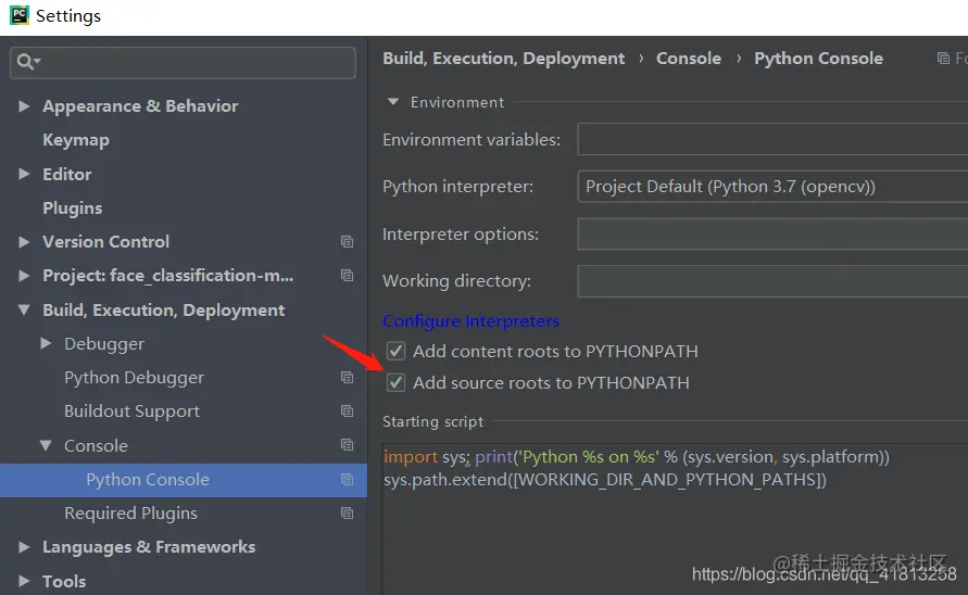 (1)打开"file"->Settings打开 Console下的Python Console,把选项(Add source roots to PYTHONPAT)点击勾选上