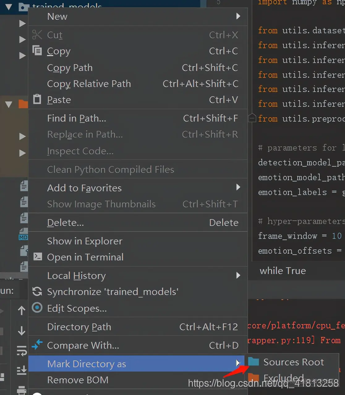 (2)右键点击自己的工作空间(文件/文件夹),点击“Mark Directory as",选择 Sources Root