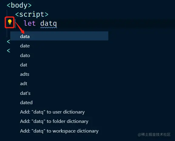 (5)Code Spell Checker —— 单词拼写检查,写错之后单词下会有波浪线并且左边会有一个小灯泡一样的提示,点击一下小灯泡,会有修改提示,选择正确的即可。