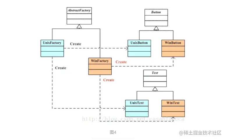 所谓抽象工厂是指一个工厂等级结构可以创建出分属于不同产品等级结构的一个产品族中的所有对象,以创建Unix控件和Windows控件为例说明,我们需要一个抽象工厂下面有两个子工厂,一个叫做UnixFactory,用于生产Unix族控件,一个叫做WinFactory,用于生产Win族控件。抽象工厂与工厂方法的区别是,工厂方法中的具体工厂一般只生产一个或几个控件对象,而抽象工厂中的具体工厂生产的是一族控件对象。如图4所示。