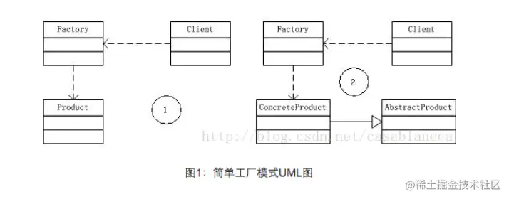 - 当系统中只有唯一的产品时,可以省略抽象产品,如图1所示。这样,工厂角色与具体产品可以合并。