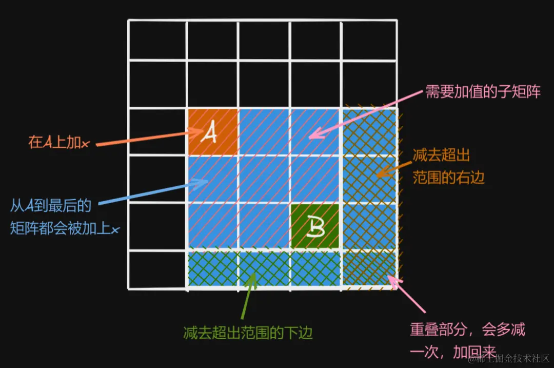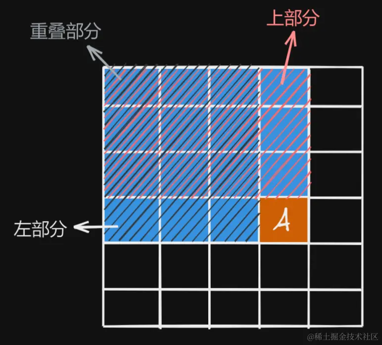 (配合下图食用)目前的A需要加上 上部分的前缀和 与 左部分的前缀和,然而又又又有重叠部分需要我们删去,把重叠部分删除即可。