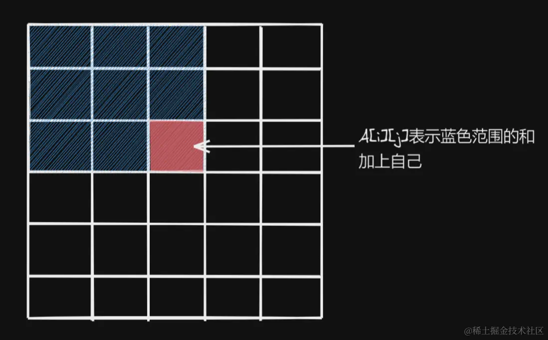 在二维数组中我们也能用到前缀和,每个元素表示(1, 1)到(i, j)方格内的和。