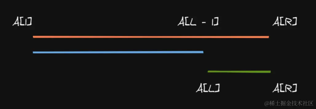 红线表示A[1] + ... + A[R]。简单来说就是S[R]减掉前面L - 1个元素就得到了A[L] + ... + A[R]。