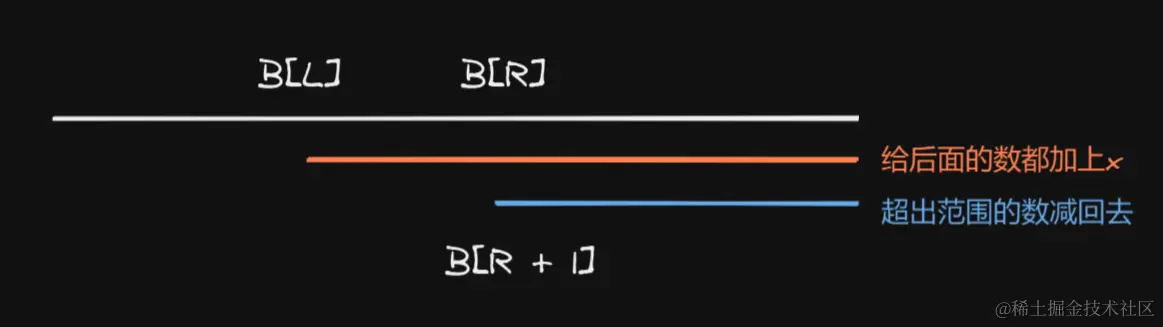 根据这个性质,在(L, R)区间内加上一个数可以用 B[L] += x, B[R + 1] -= x来实现,让数组从L开始到最后都加上x,但由于是加到最后,可能超出了R的范围,所以我们需要让R后面的都减去x,保持原来的值。