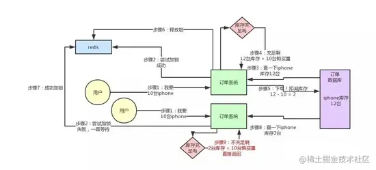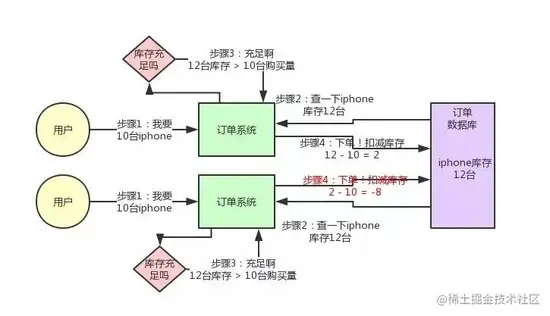 这个图,其实很清晰了,假设订单系统部署两台机器上,不同的用户都要同时买10台iphone,分别发了一个请求给订单系统。接着每个订单系统实例都去数据库里查了一下,当前iphone库存是12台。
