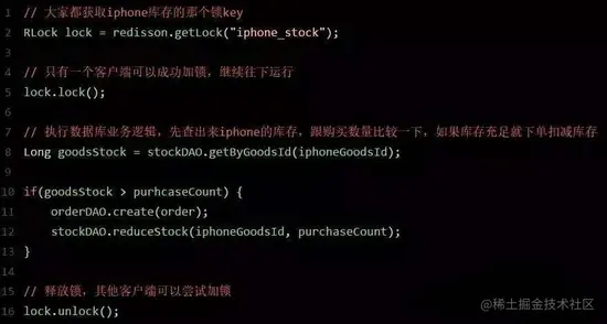 比如,对iphone这个商品的下单,都必对“iphone_stock”这个锁key来加锁。这样会导致对同一个商品的下单请求,就必须串行化,一个接一个的处理。大家再回去对照上面的图反复看一下,应该能想明白这个问题。