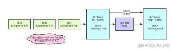 那么1秒是1000毫秒,只能容纳50个对这个商品的请求依次串行完成处理。比如一秒钟来50个请求,都是对iphone下单的,那么每个请求处理20毫秒,一个一个来,最后1000毫秒正好处理完50个请求。