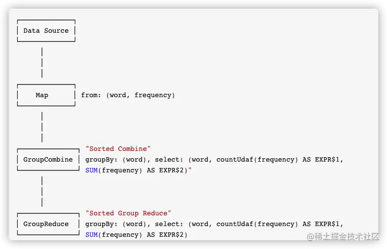 在 DataSetAggregate.translateToPlan 中生成了执行计划。原来Flink把 SQL 语句分割成两个阶段: