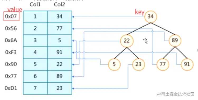 假设是如上图的二叉树的结构Clo2这一列做索引,也不是不可以的,假设我要查询89这个数,假设我是没有索引,要查询6次才可以查询到想要的结果,有了索引,