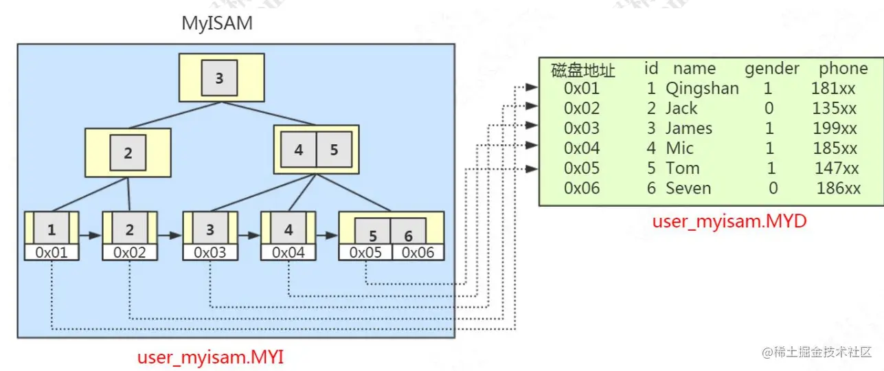 MylSam存储引擎主键索引和普通索引的底层存储结构