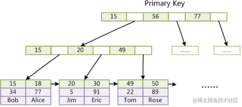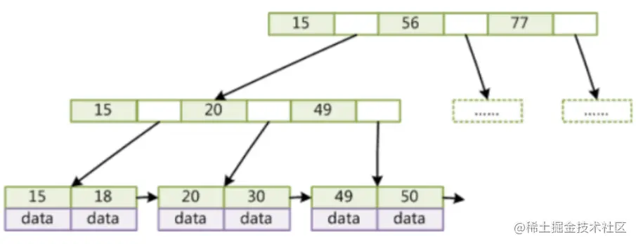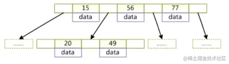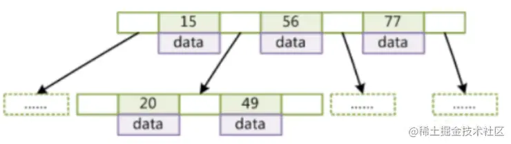 先从磁盘加载第一个节点[15,56,77]的数据到内存和49进行比对,发现49在15和56之间,然后加载[15,20,49]