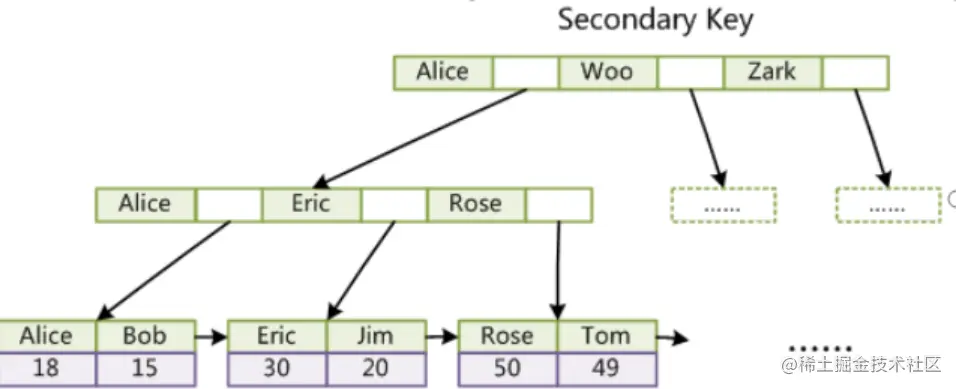 特点:非叶子节点,存储的是所在行的主键,这个是主键索引是不一样的地方