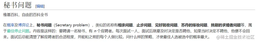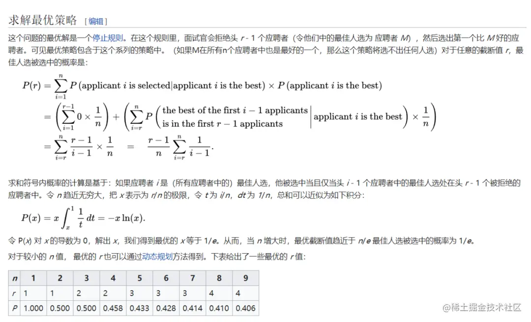 其实这个问题的原型叫做秘书问题,该类问题全部属于最佳停止问题。