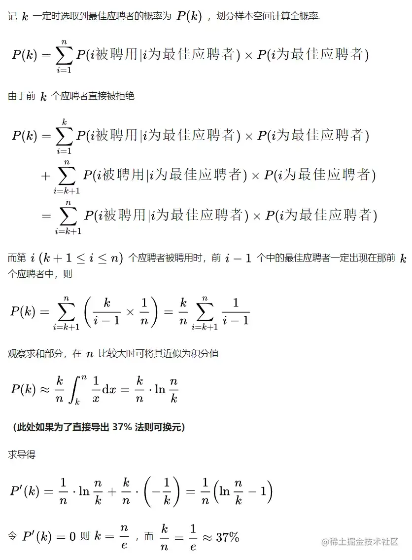 现在要聘请 1 名秘书,共有 n 个应聘者,每面试 1 人后,就知道了应聘者的好坏程度,且必须立刻决定是否聘用,不可重复面试。策略是拒绝前 k 个应聘者,而从第 k+1 个应聘者开始,一旦有比前 k 个都好的,就立刻聘用。如何决定 k 的值,使得聘用到最佳应聘者的概率最大?
