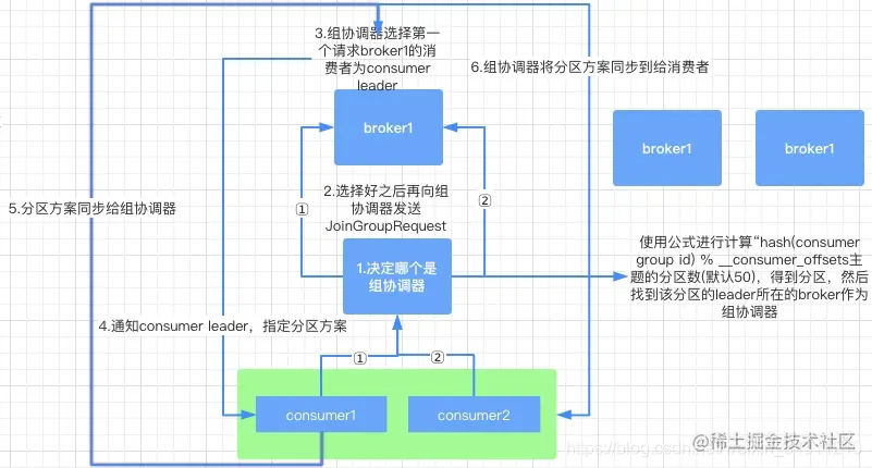 选择组协调器(GroupCoordinato) 因为每个消费组的消费offset提交到的分区是确定的,即通过公式hash(consumer group id) % __consumer_offsets主题的分区数计算而来,所以kafka就直接把这个提交的分区所在的副本leader当作组协调器。
