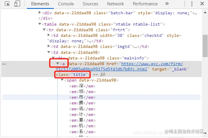 ③我们可以看到,这是一个a标签,class为title的html代码,所以,如果报错,可根据这个操作更换。比如,class改为了company_title,那代码也可对应的改为:soup.find_all(‘a’,{‘class’: ‘company_title’})[0].get(‘href’)