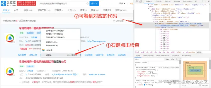 ②就点击“深圳市腾讯计算机系统有限公司”这个点击操作而言,右击,然后选择“检查”选项,然后就可以看到开发者调试页面那里也自动跳转到了相关的位置。