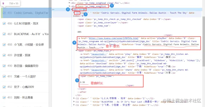 通过对 HTML 源码分析,“ 歌手-歌名 ” 信息被封装在 标签中, 标签在
