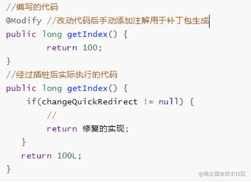 Robust是对每个函数都在编译打包阶段自动插入了一段代码。类似于代理,将执行的方法重定向到其他方法中(Instant Run)。