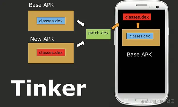 Tinker通过计算对比指定的Base Apk中的dex与修改后的Apk的区别,补丁包中的内容即视为两者差分的描述。运行时将Base Apk中的补丁包进行合成,重启后加载全新的合成后的dex文件。