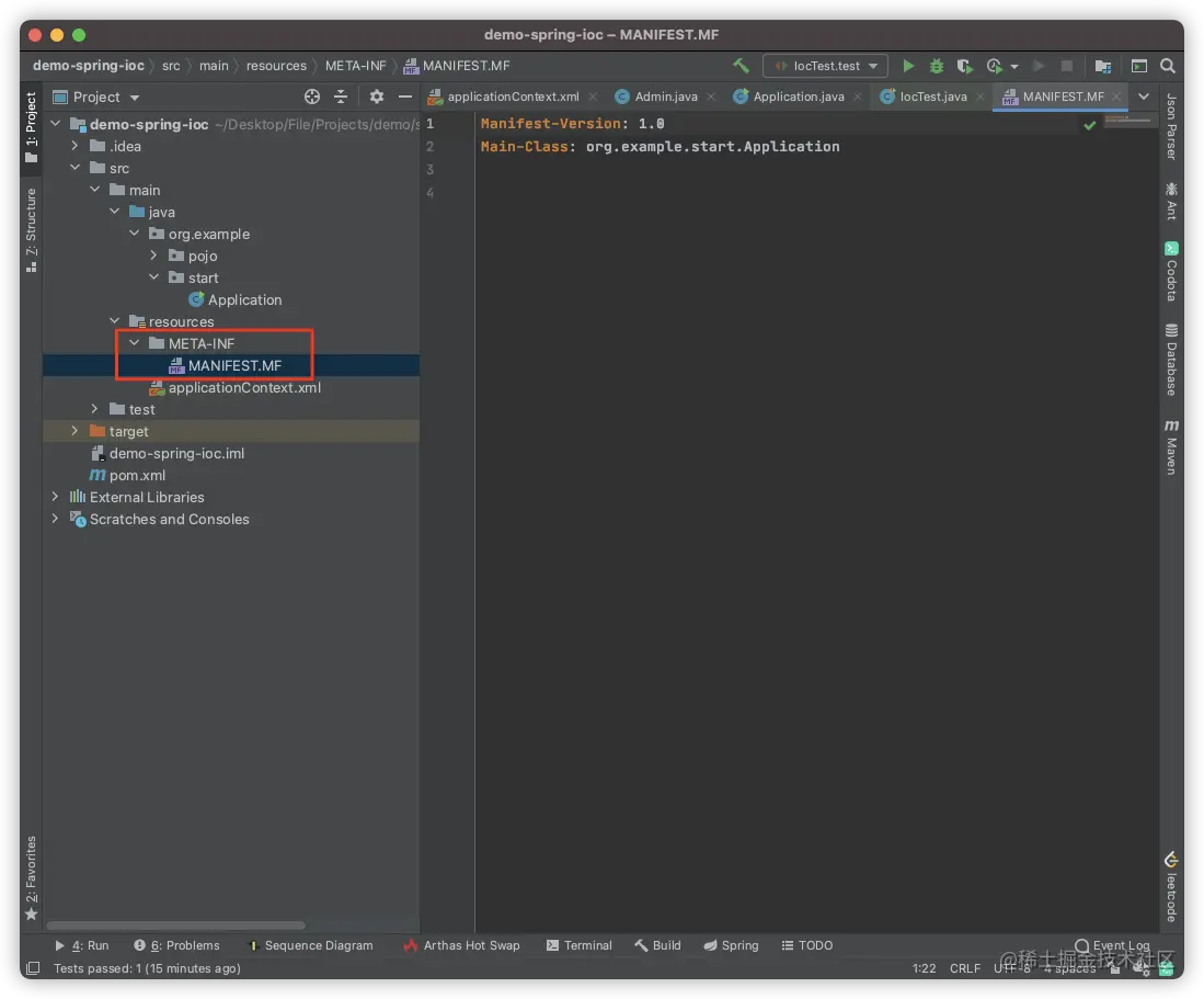 IDEA 选择菜单栏 Build - Build Artifacts,使用终端切到前面提到的 Output directory 目录下,可以看到打出的jar包,执行 java -jar demo-spring-ioc.jar 命令,可以看到输出: