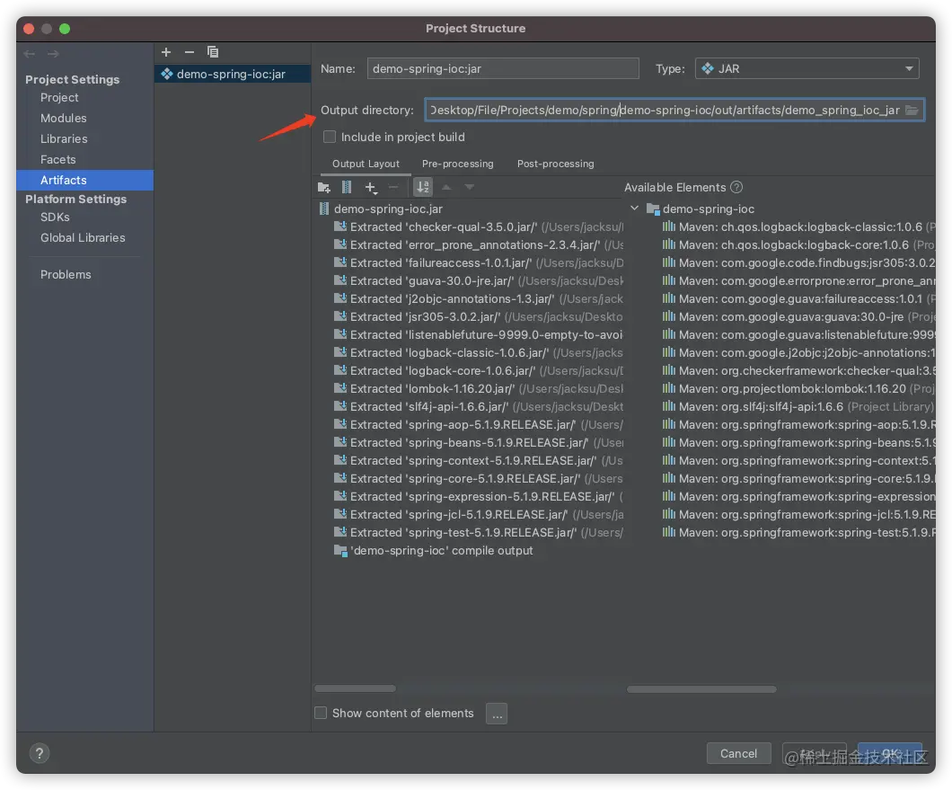 点击确定,注意这里的 Output directory ,它是打的 jar 包的存放位置。