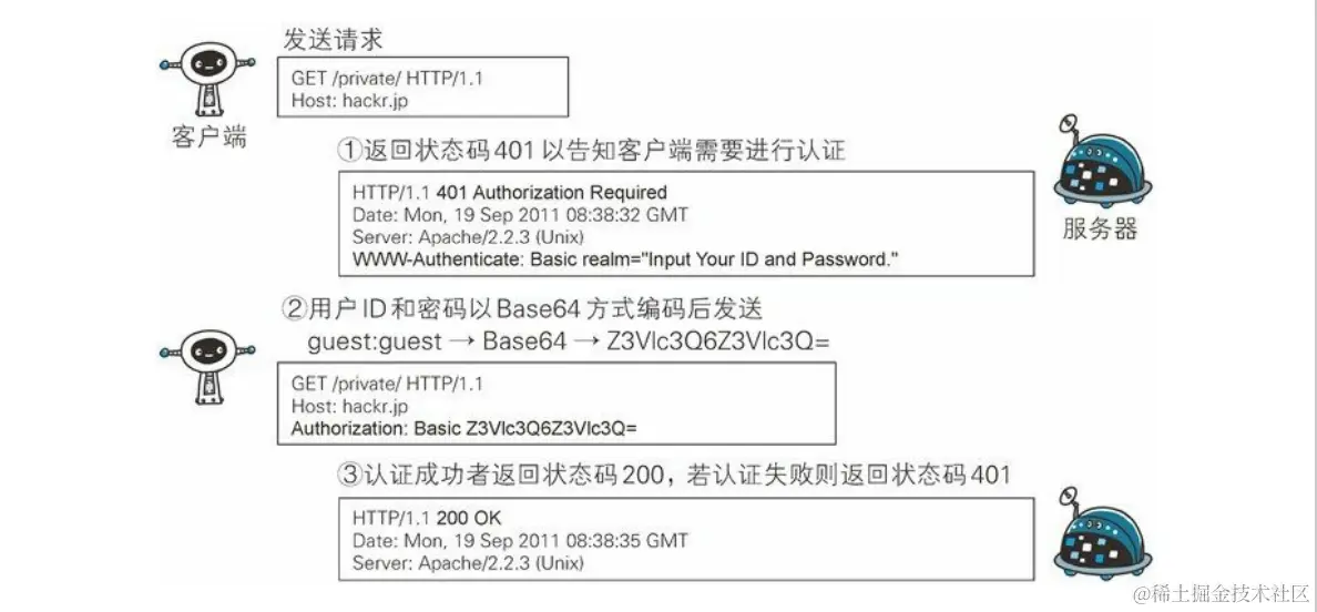 BASIC 认证虽然采用 Base64 编码方式,但这不是加密处理。常见于路由器的登录认证。