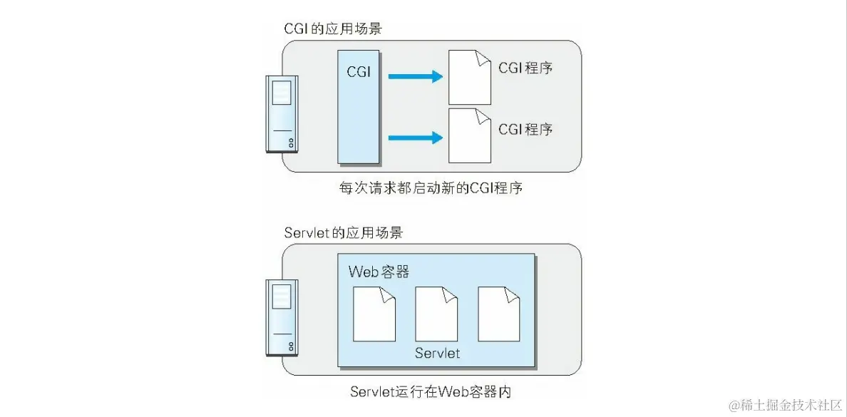 Servlet 是一种能在服务器上创建动态内容的程序。Servlet 是用 Java 语言实现的一个接口,属于面向企业级 Java(JavaEE,Java Enterprise Edition)的一部分。之前提及的 CGI,由于每次接到请求,程序都要跟着启动一次。因此一旦访问量过大,Web 服务器要承担相当大的负载。而 Servlet 运行 在与 Web 服务器相同的进程中,因此受到的负载较小 。Servlet 的运行环境叫做 Web 容器或 Servlet 容器。