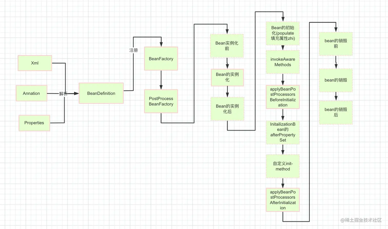- Bean的BeanDefiniton在解析,由Annotation或者XML、Properties加载,解析并转化为BeanDefiniton.