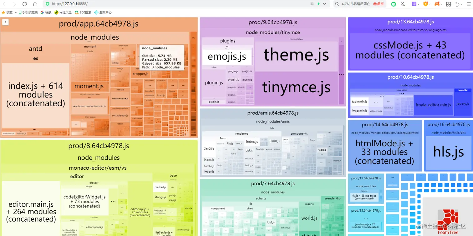 看了下webpack配置文件,其中使用了webpack-bundle-analyzer这个插件,它不仅会分析打包文件的模块构成占比,而且会启动一个浏览器页面(如下图),怀疑它可能是比较耗时的,于是将其注释掉。