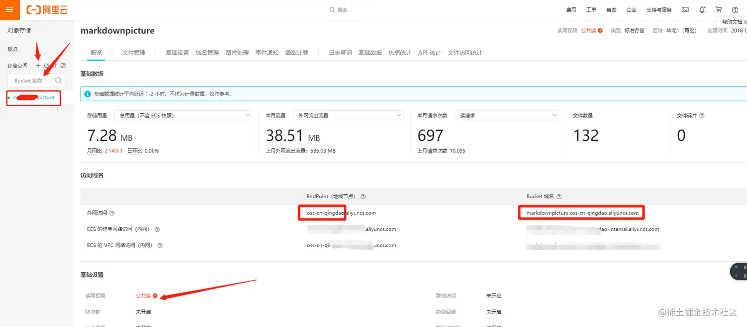 打开oss之后,需要自己建立Bucket(存储空间名),存储区域(比如oss-cn-qingdao),除此之外还需要keyid和keysecret。(一定要打开公共读的权限,要不是访问不了的,但是不要打开公共写!!!)