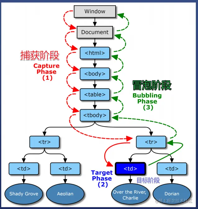 下面放一张示图来帮助理解事件捕获和事件冒泡。