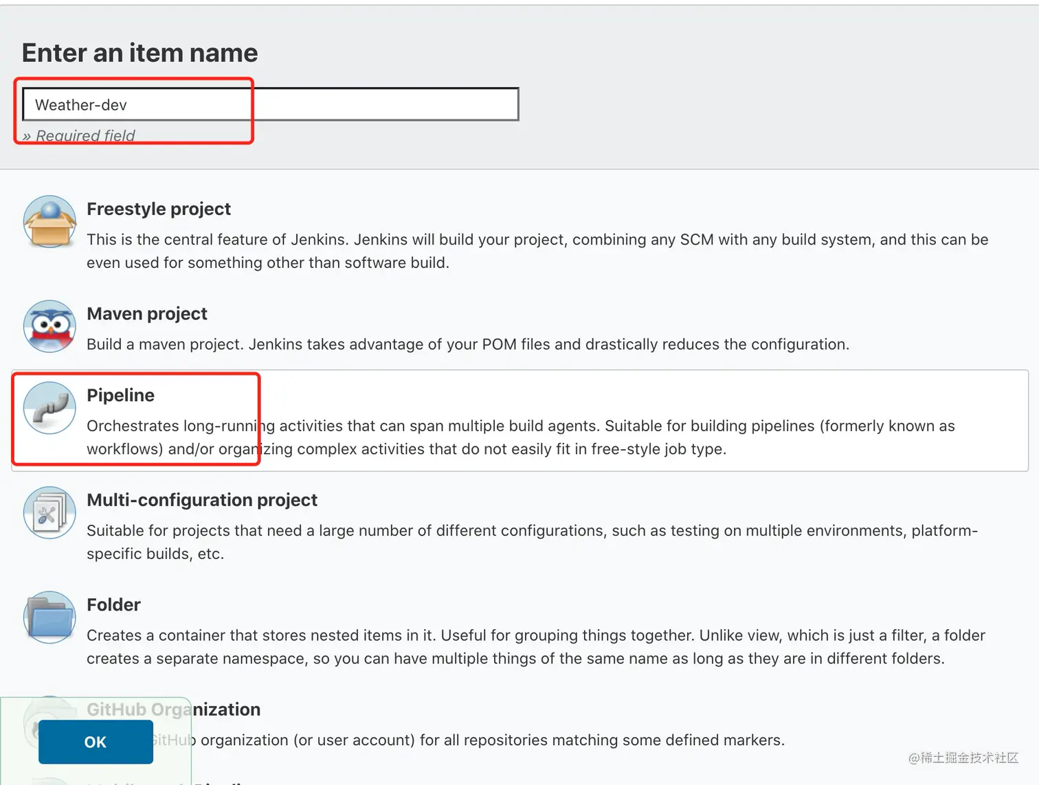 选择以哪种方式进行构建,这里选择Pipeline,点击ok