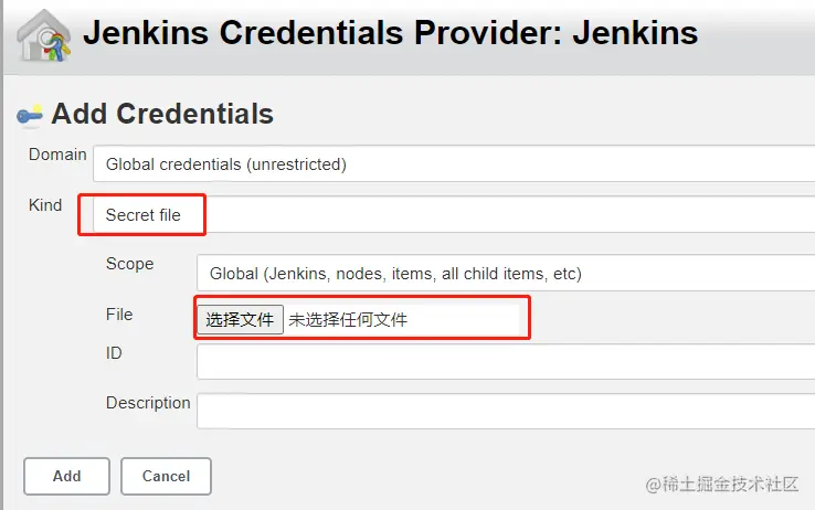 Credentials: 这里创建一个凭证,如下图,Kind选secret file,在File选择admin.conf上传(在Kubernetes集群master节点的