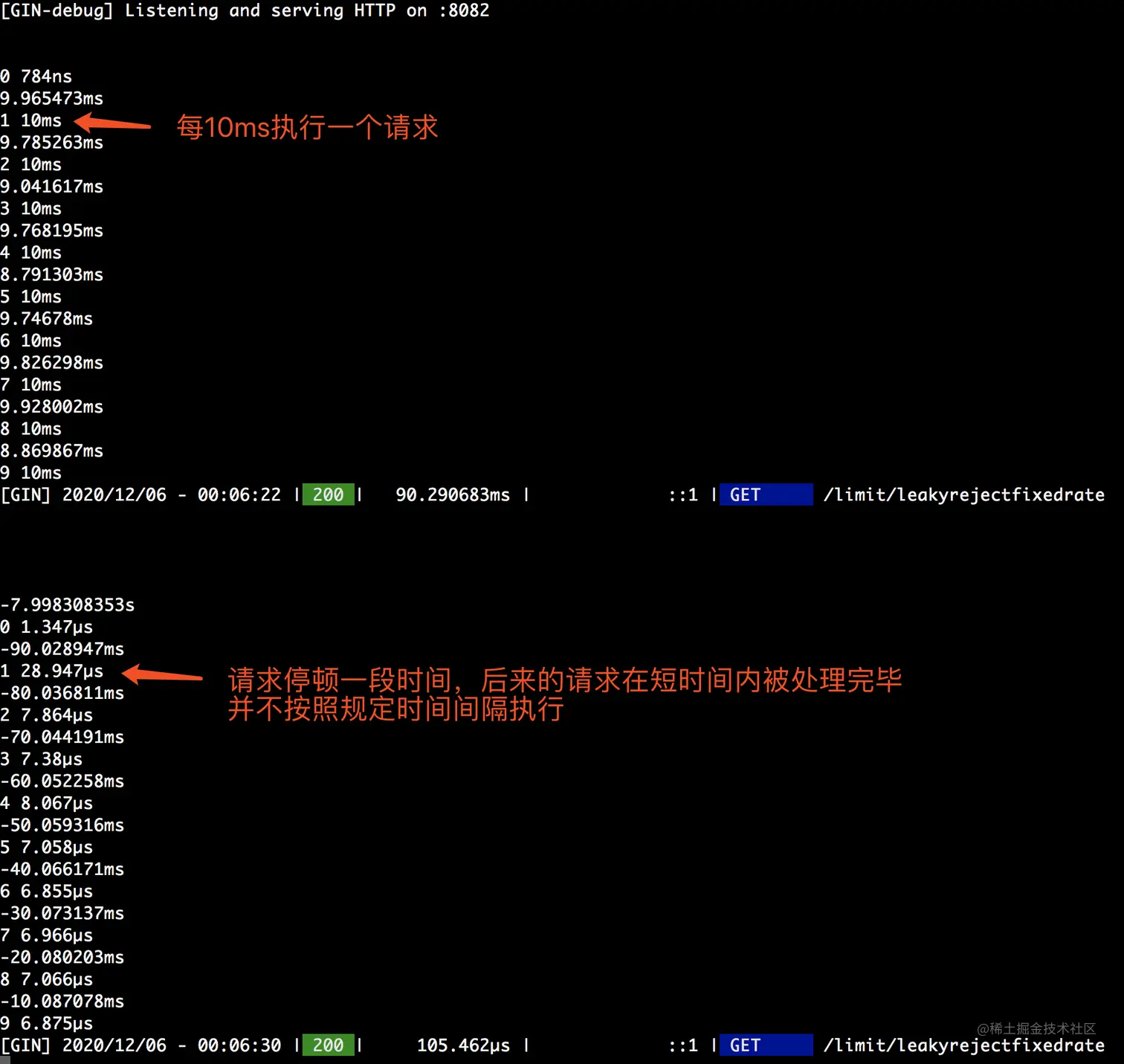 该实现保证如果有大量请求,每一个请求会按照规定的时间间隔执行。如设置1s处理100个请求,则每10ms会处理一个。