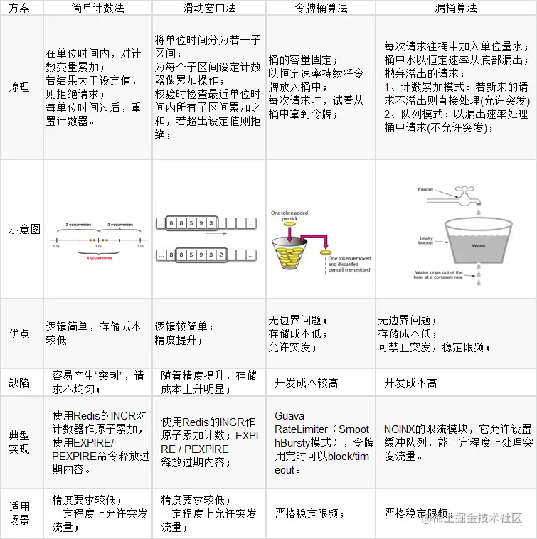 - 漏桶则是按照常量固定速率流出请求,流入请求速率任意,当流入的请求数累积到漏桶容量时,则新流入的请求被拒绝;