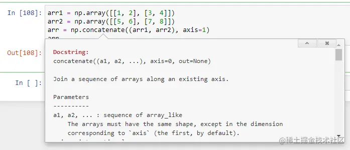 我们把鼠标移到 concatenate,按快捷键Shift+Tab查看方法说明。可以看到concatenate方法沿着现有的轴进行合并操作,默认axis=0。当我们设置axis=1后,合并操作沿着列进行。