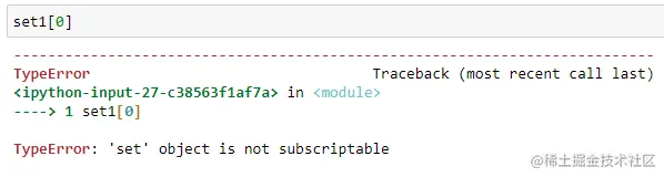 与列表和元组不同,集合是不可下标的,如: