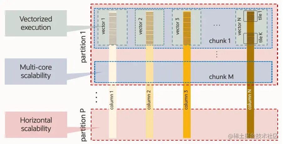 在 MAE 内部,由多个分析节点组成。其具体节点数量,可由 MySQL 分析引擎提供的自动配置顾问自动获得。在节点中,数据以一种混合列压缩的格式存储。这有助于向量化处理,从而获得非常好的查询性能。数据在内存中运行之前被编码和压缩。这种压缩和优化的内存使用,对于数值和字符串数据尤为显著,可提高性能并减少内存占用,从而为客户降低成本。同时在每个节点中使用并行操作技术,这为分析提供了高缓存命中率,并提供良好的节点间可伸缩性。集群内的每个分析节点和节点内的每个核心都可以并行处理分区数据,包括并行扫描、连接、分组、聚合和 top-k 处理。