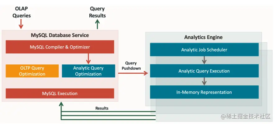 MySQL 分析引擎与 MySQL 数据库服务的集成为企业的所有 OLTP 和分析需求提供了一个单一的数据管理平台。MySQL 分析引擎被设计成一个 MySQL 可插拔存储引擎,它完全屏蔽了存储层的所有底层实现细节,不让最终用户看到。用户和应用程序通过集群中的 MySQL 数据库节点与 MySQL 分析交互。用户通过标准工具和基于标准的 ODBC/JDBC 连接器连接到 MySQL 分析引擎。MySQL 分析引擎支持与 MySQL 相同的 ANSI SQL 标准和 ACID 属性,并支持不同的数据类型。这使得现有的应用程序无需对其应用程序进行任何更改就可以利用 MySQL 分析引擎,从而实现简单快速的集成。一旦用户向 MySQL 数据库提交查询,MySQL 查询优化器就会透明地决定是否将查询卸载到分析集群以加速执行。这是基于 MySQL 分析引擎是否支持查询中引用的所有操作符和函数并且使用分析引擎处理查询的估计时间比在 MySQL 中更少时,查询将被下推到分析节点进行处理。处理之后,结果被发送回 MySQL 数据库节点并返回给用户。