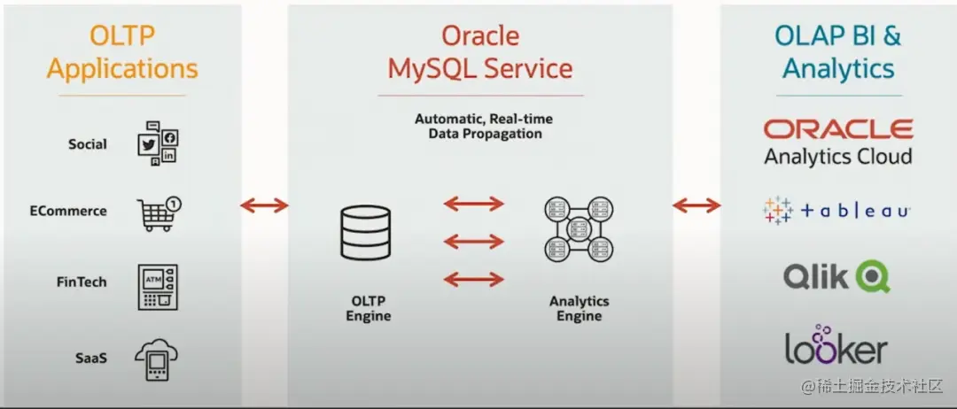 从产品角度来看,MySQL Analytics Engine 是一种云原生服务,专门在 Oracle 云基础设施中提供,为分析工作负载提供了令人信服的性能和成本。使用 MySQL 数据库管理企业数据的组织现在可以使用 MySQL 分析引擎运行分析查询,性能显著提高,成本更低,不需要 ETL,并且支持实时分析。该服务可以只部署在云中,也可以部署在混合环境中,它简化了事务和分析应用程序的管理。从其推出产品上,可归纳为以下几个理念: