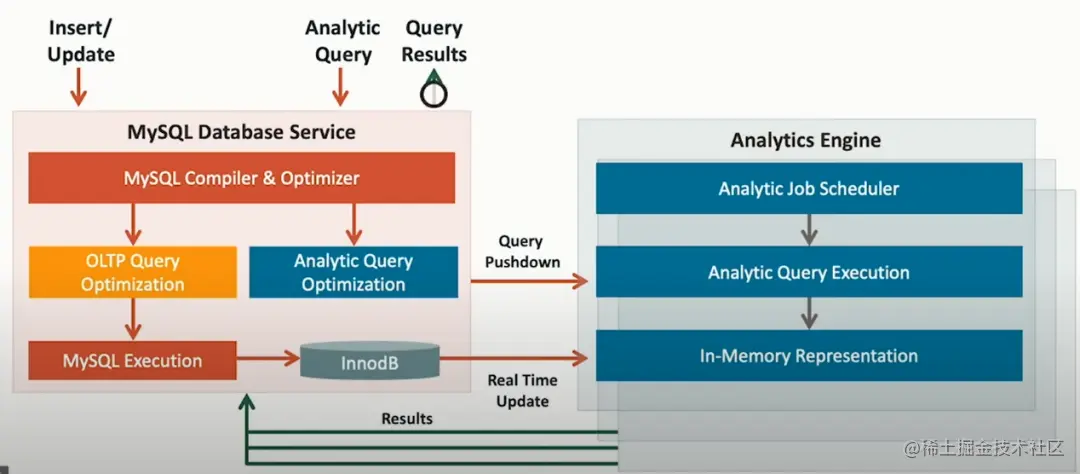 由于 MySQL 分析引擎是一个内存处理引擎,数据被持久化到 MySQL InnoDB 存储引擎中。对表的任何更新都会自动实时地传播到分析节点的内存中。这使得后续查询始终能够访问最新的数据。这是通过一个轻量级的更改传播算法在后台完成的,该算法可以跟上 MySQL 的数据更新率。同步原理未说明?