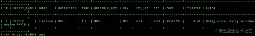 通过查看执行计划,可以直观看出是否使用了分析集群(下图中的 Using secondary engine RAPID)