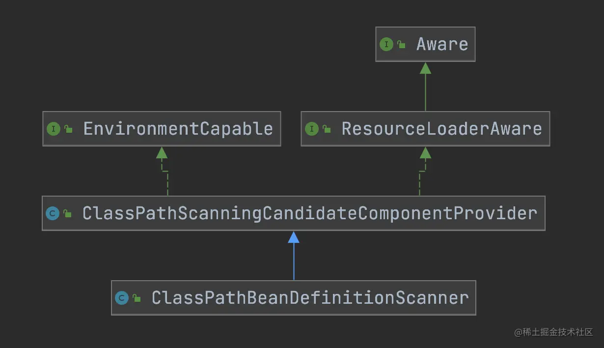 ClassPathBeanDefinitionScanner 继承了 ClassPathScanningCandidateComponentProvider,而上面说的这三个方法,其实都是父类 ClassPathScanningCandidateComponentProvider 的方法。
